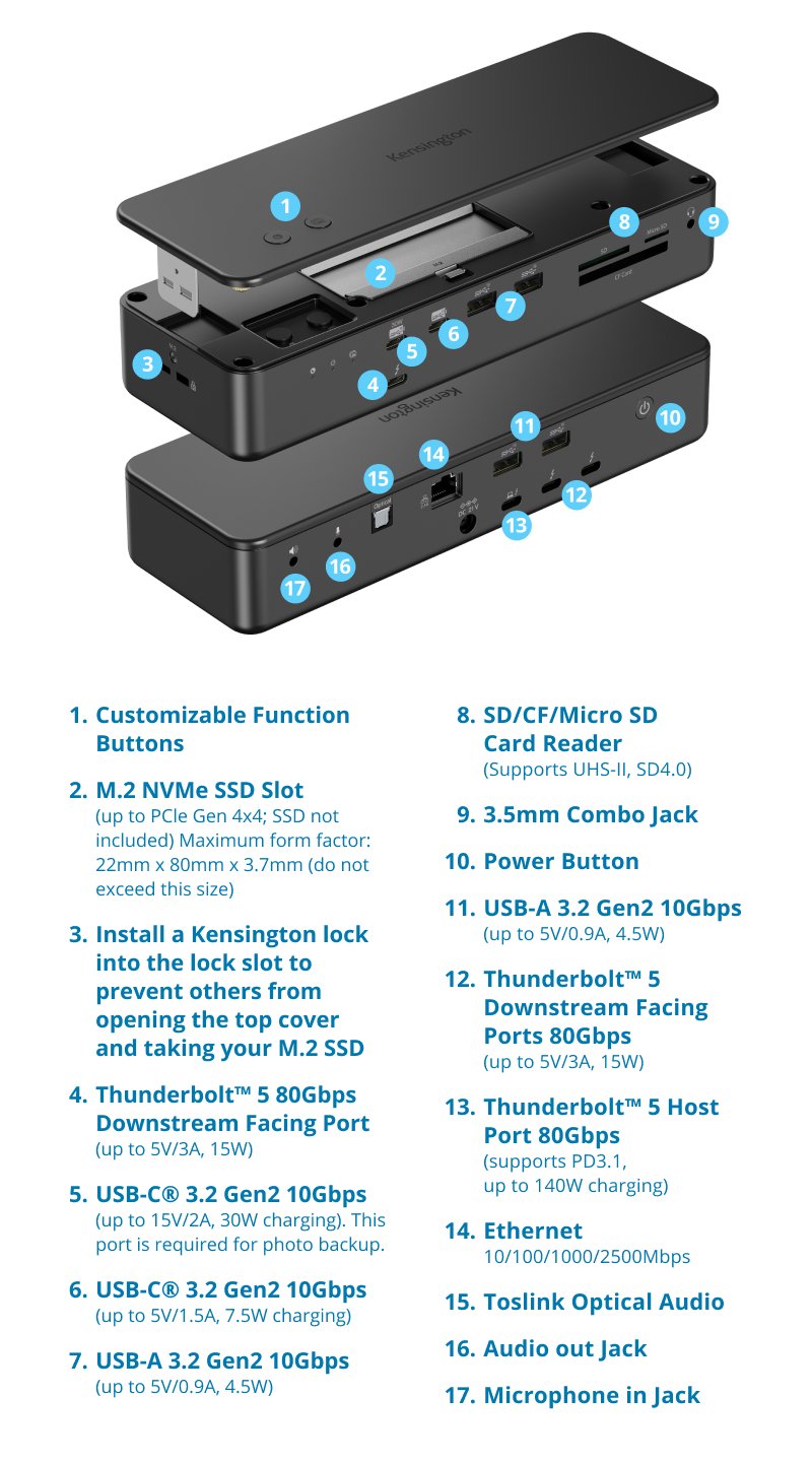 Download Kensington Konnect™Introducing the Kensington® EQ Pro Thunderbolt™ 5 Dock Designed for MacBook, optimized for M-series Pro/Max models. It offers 80Gbps data transfers, a built-in and lockable PCle M.2 SSD slot for quick storage expansion, and dedicated buttons for iPhone photo backups and Focus Mode. Supporting up to two 6K displays, multiple accessories, and up to 140W Power Delivery, the EQ Pro Thunderbolt™ Dock optimizes your workspace for maximum productivity.