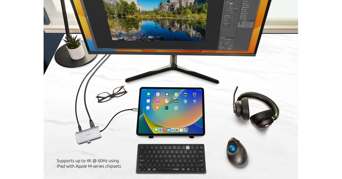 Kensington's standard docks do it all. The portable mobile dock, UH1510P, supports iPads with M1 or newer chipsets, enabling extended mode on an external monitor at up to 4K @ 60Hz. The setup looks clean, with the iPad neatly placed on a laptop riser, alongside a wireless keyboard, trackball, and wireless headset on the worktable.