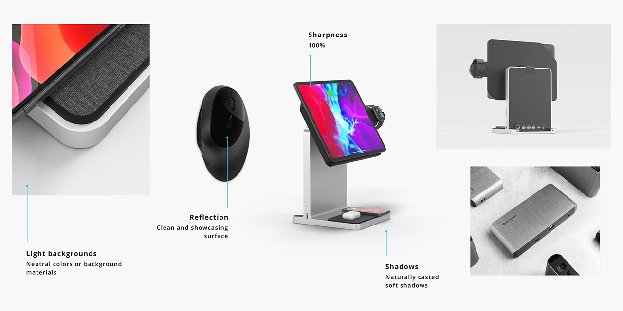 For hero shots, find the angle that most clearly define the product and that has a visual impact. This is usually front, top or a horizontal 45° angle to the camera. The height can also vary by product.