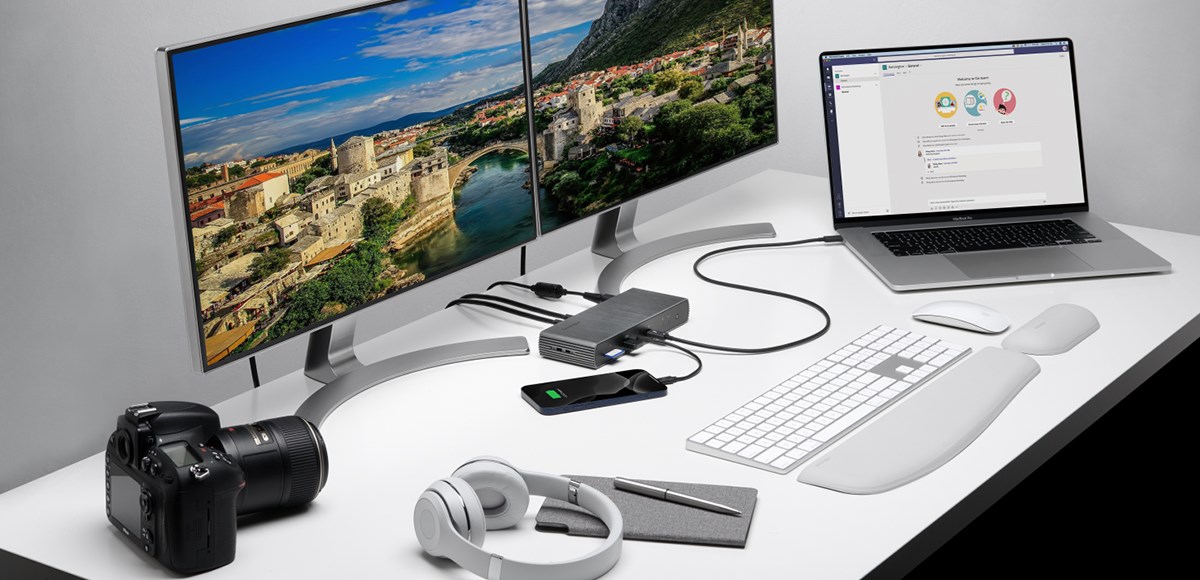 ドッキングステーションは、デスクに設置して、ノートPCなどのモバイルデバイスをデスクトップ仕様のデバイスにも使用できるよう機能拡張を行います。ドッキングステーションは、Thunderbolt 4、Thunderbolt 3、USB-CまたはUSB-A経由で接続し、ドッキングステーションを介してデバイスおよびデバイスに接続された周辺機器に電源を供給します。
