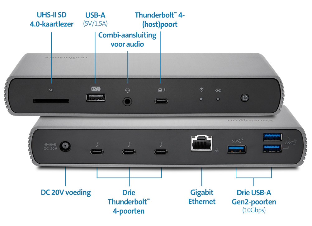 A: Eén compacte poort biedt nu Thunderbolt 3-gegevensoverdracht, ondersteuning voor twee 4K 60Hz-beeldschermen en snel opladen van notebooks tot 100W met een enkele kabel. Bovendien kunnen alle Thunderbolt- of USB-dockingstations worden aangesloten op een Thunderbolt 3-computer, wat het tot de meest geavanceerde en veelzijdige USB-C-dockingpoorten op de markt maakt.